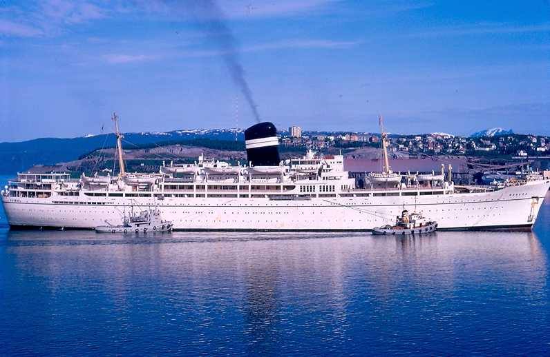 Built as a troopship (yellow funnel), then in late 1962 trooping by sea ended and she was converted into a schools’ cruise ship.