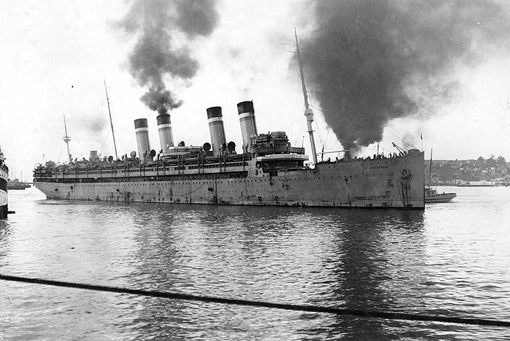 Kronprinzessin Cecilie at Bar Harbor, Maine with black funnel tops painted in order to imitate the British liner Olympic