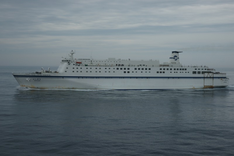 ISHIKARI (1991) – departing, passing by the KISO (1987) from RODOS Island – which is tied up.