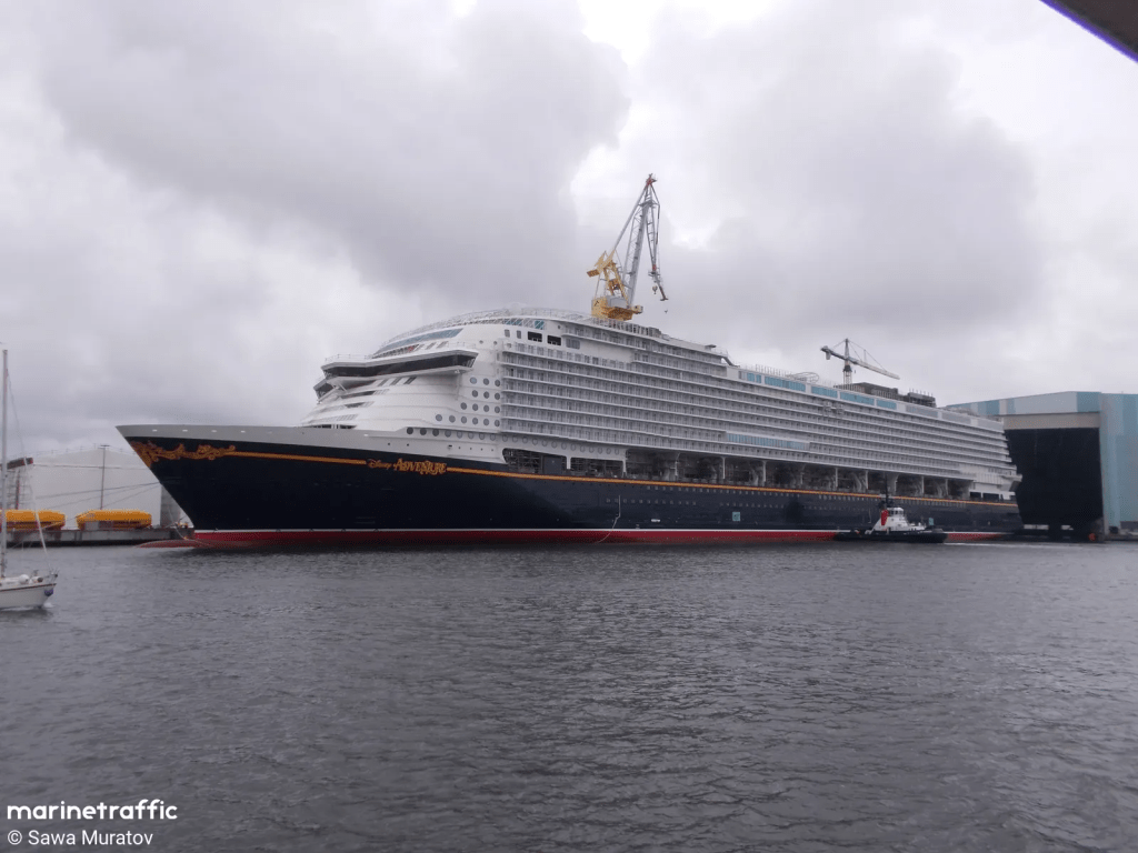 208000GT, 342m x 46.4m, 6000 passengers and renamed Disney Adventure for Disney Cruise Line and completed at Meyer, Wismar